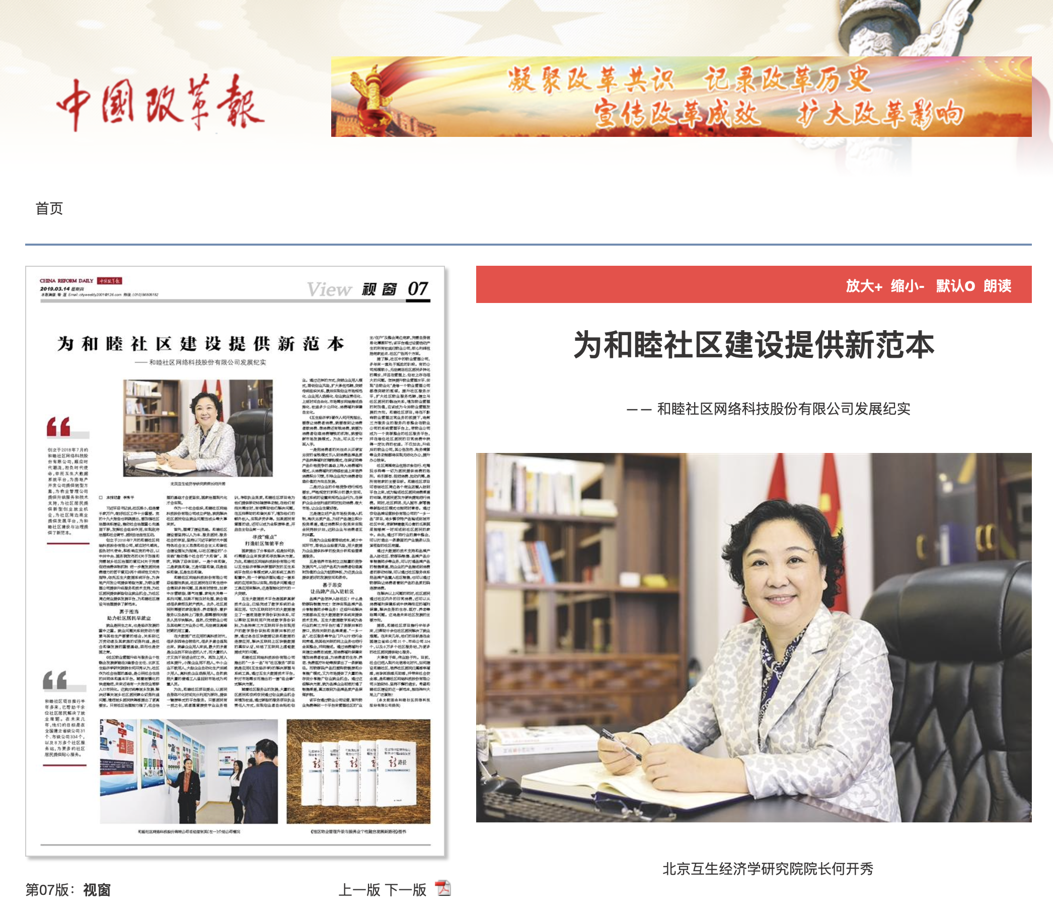创立于2018年7月的和睦社区网络科技股份有限公司,顺应时代潮流,担负时代使命,积极响应党的号召,以中共中央、国务院发布的《关于加强和完善城乡社区治理的意见》《关于完善促进消费体制机制 进一步激发居民消费潜力的若干意见》两个纲领性文件为指导,依托互生大数据系统平台,为房地产开发公司提供转型方案,为物业管理公司提供升级服务和技术支持,为社区居民提供新型创业就业机会,为社区周边商业提供发展平台,为和睦社区建设与治理提供了新范本。