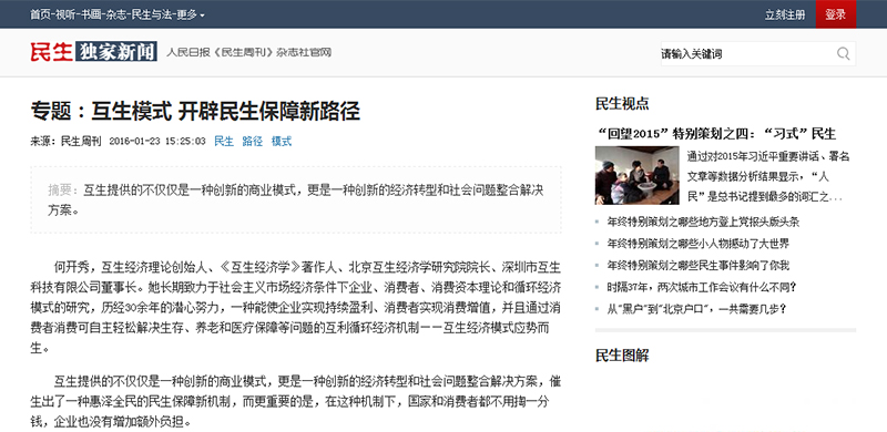 专家认为,“互生模式的魔力在于对消费权益的再分配,构建了一个互利循环的消费者自主的保障机制,消费者的生存养老、医疗、就业、教育等问题一揽子得到解决,而且国家不用为消费者买单,还可以增加税收,企业没有增加负担,消费者得到永续保障,这是政府行政手段难以做到的”。(作者:钟绍军)