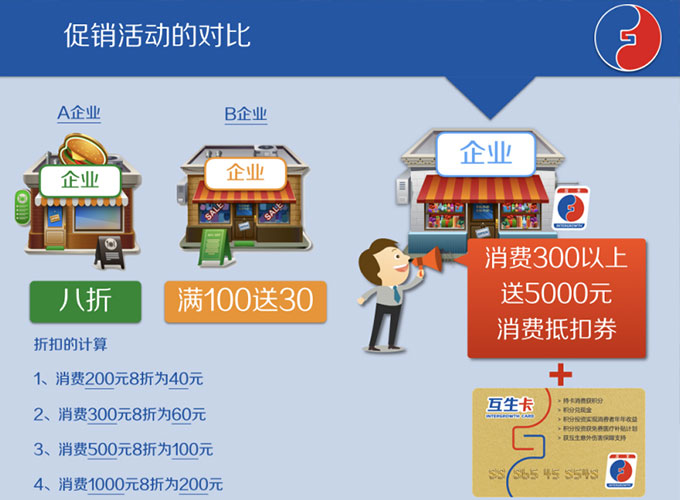 当参与发卡的企业在发卡做促销活动的时候,向周围商家做了推广工作,那么,周围商家要是也参与发卡,互生托管项目的股权里就有20%是给做了推广工作的企业,因此就多赚20%。如果一家企业发了一万张卡,但自己的生意不好,而由他做了推广的企业也发了一万张卡且生意好,那样,生意好的发卡企业赚了30%,生意不好的企业也可以赚20%,两家企业因此形成了连锁联盟,顾客无论在谁家消费,不光顾客两边消费两边都赚钱,顾客到各处消费,两家企业都有钱赚,这样就实现了跨界连锁联盟,互惠互利。举一个例子,A企业发了一万张卡能够享受30%,签约的B企业也发了一万张卡,B有30%的股份,A却多了20%,A和B就变成了联盟连锁,而且是跨界的联盟连锁。A签约C企业,C发了1000张卡获得3%,A有2%。但注意一点,B和C自己去签约的,跟A企业没有关系。但是,A企业锁定的顾客到所有的店去消费,A全部都有赚钱。这样,就实现了企业的二次创业,同时实现了企业的跨界连锁联盟。