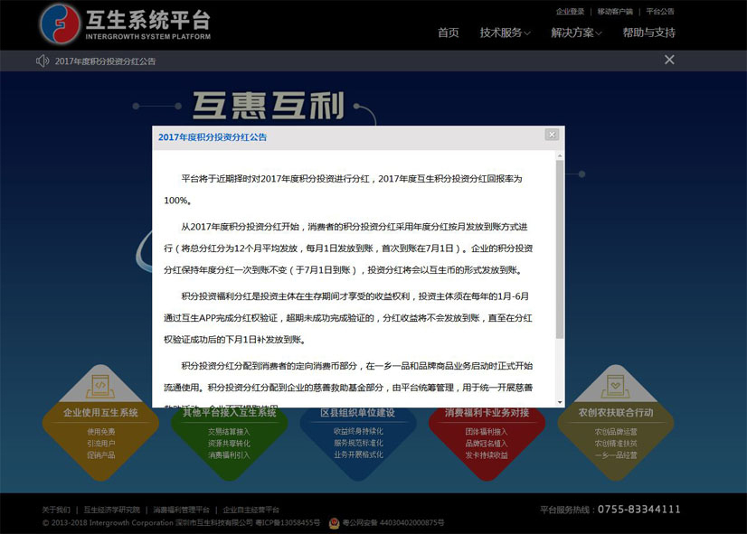 互生系统平台的公告中说,平台将于近期择时对2017年度积分投资进行分红。从2017年度积分投资分红开始,消费者的积分投资分红采用年度分红按月发放到账方式进行(将总分红分为12个月平均发放,每月1日发放到账,首次到账在7月1日)。
